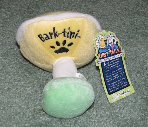 Bark-tini is a fun little stuffed toy for your dog. Your puppy may like to enjoy a conine sauvignon. There is also a squeaker in this toy. Made by Just Bepaws. Toy is about 6 inches tall and 5 inches wide. Color is as shown.